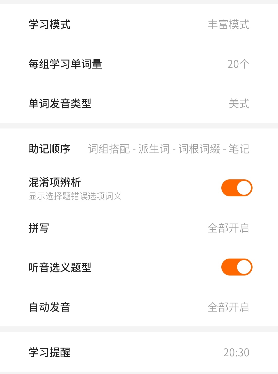 重点说一下一定要开启“混淆项辨析”和听音选义题型!